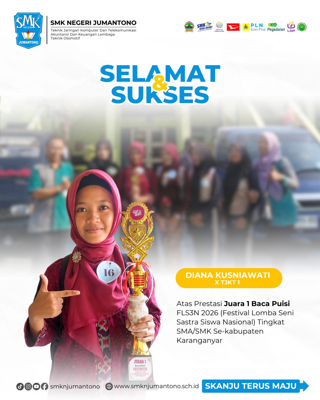 Prestasi membanggakan kembali diraih oleh siswa SMK Negeri Jumantono. Diana Kusniawati, siswi kelas X TJKT 1, berhasil meraih Juara 1 pada cabang lomba Baca Puisi dalam ajang FLS3N 2026 (Festival Lomba Seni dan Sastra Siswa Nasional) tingkat SMA/SMK se-Kabupaten Karanganyar.
